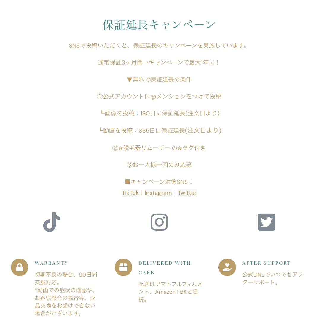 ・SNS投稿で180日〜最大1年間に保証を延長するキャンペーンを行っています。※詳しくはご購入後、公式LINE登録直後にご案内いたします。